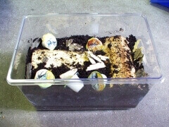 このような感じでセットを組んで約2ヶ月程度放置します。(勿論その間えさ交換はします)私はクワガタの場合なるだけ採卵はしない派ですので、幼虫が孵化してくれるまで待ちます。もし早くに材がボロボロに齧られてしまっていた場合には新しい材を追加交換します。