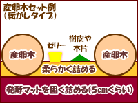 ケース底面を固くつめ、材を入れ、その回りは柔らかく詰める。上部2~3cmほどは柔らかくマットを入れる。少し材の頭が出るようにセット。