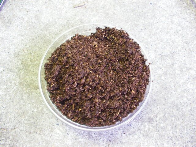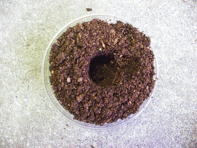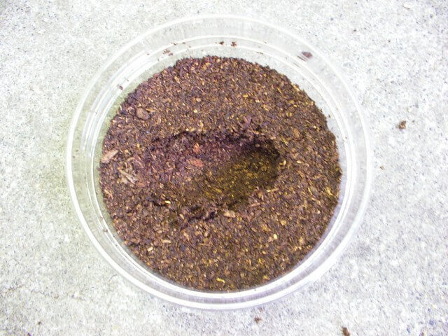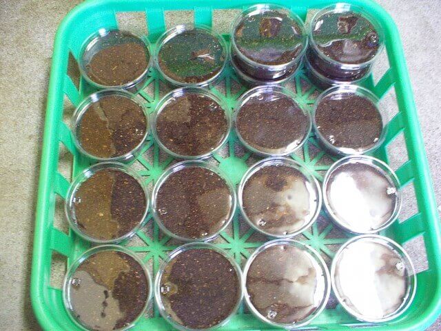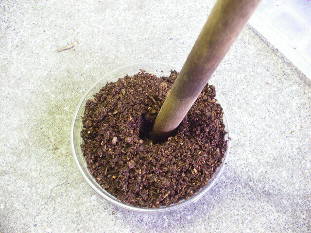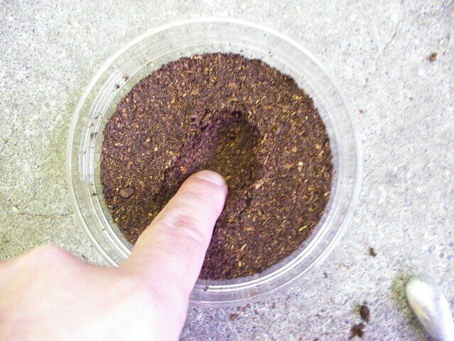 プリンカップ200ccに「くわマット」を詰める。マットは勿論加水調整してあります。手でぎゅっと握って水が染み出ない程度で、土団子が作れる程の水分量です。