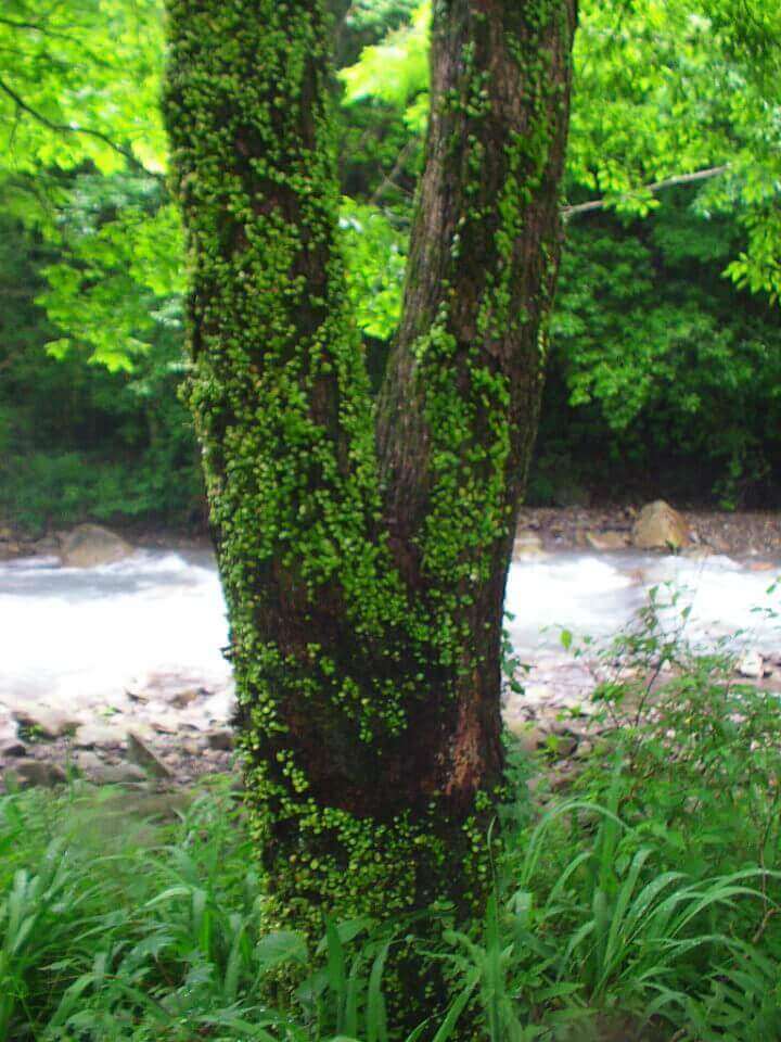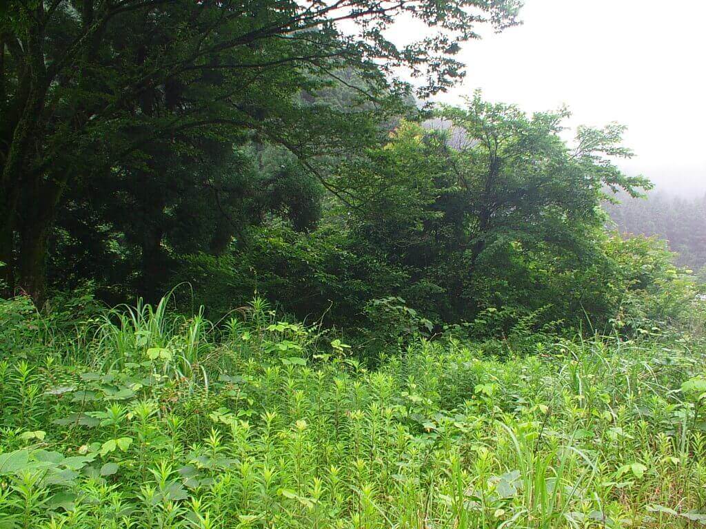 採集ポイントに到着。うっそうとしたところですが、向こうにはクヌギやニレの樹があります。