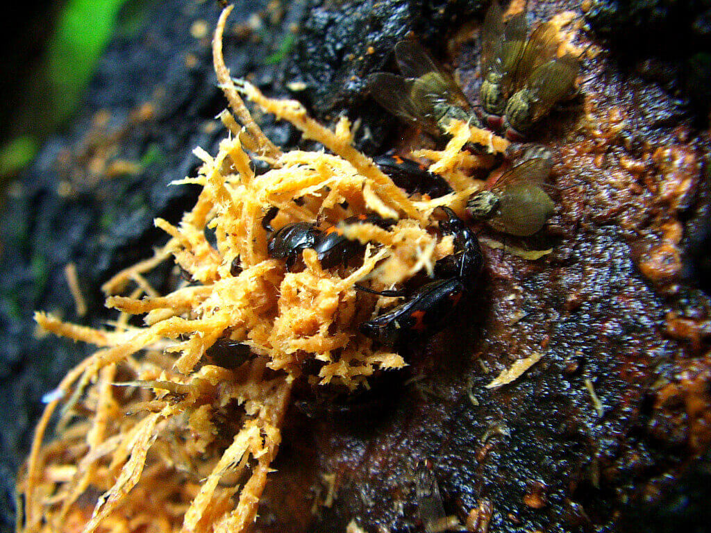 この虫、樹液採集中は頻繁にお目にかかります。詳しく調べてみると、名前は「ヨツボシケシキスイ」と言うそうです。非常に小型で、♂で10~15mm程度、♀は5~8mm程度の大きさしかありません。