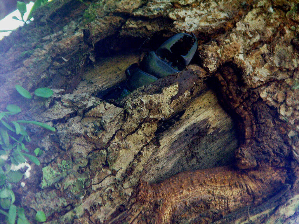 樹皮がめくれている場所に潜むヒラタクワガタ