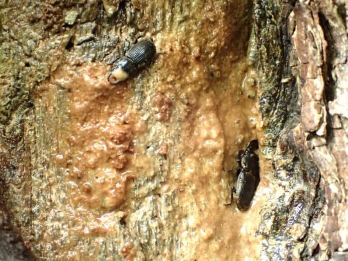 ハルニレの樹液だまりに埋もれるような感じでネブトクワガタ2♂がいます。
