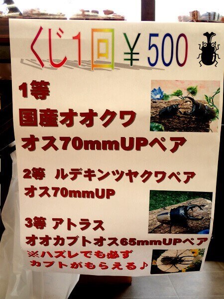 はずれは無し。はずれた場合は国産カブトムシのペアが当たります。