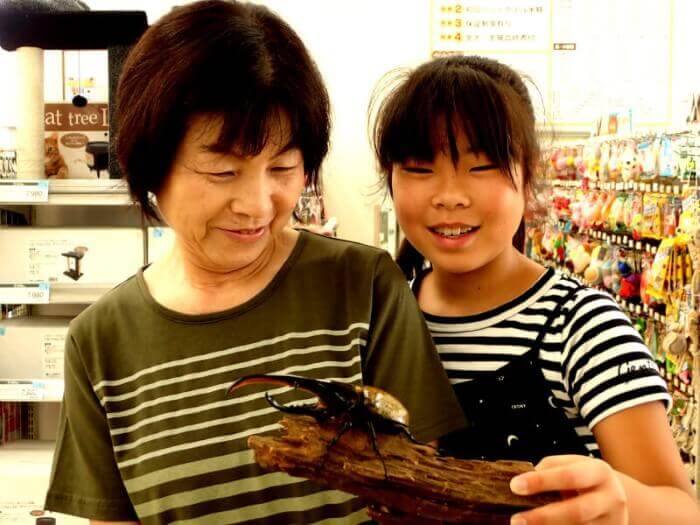ヘラクレスの成虫を手に喜ぶ女の子と御家族。