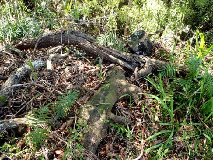 その近くに枯れ木と枯れ葉が堆積している場所を見つけました。