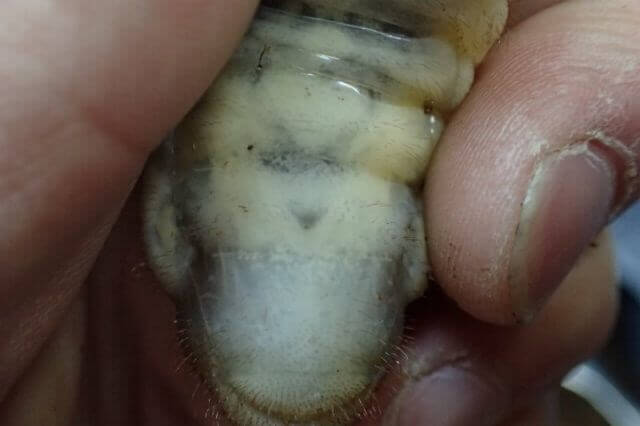 国産カブトムシ幼虫の場合お尻から2番目の線と3番目の線の間に(v)のvマークがあるかないかで判別します。