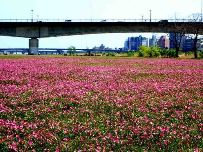 採集地に行く途中、宮崎を流れる大淀川の堤防では見事な蓮華畑が咲き誇っていました。