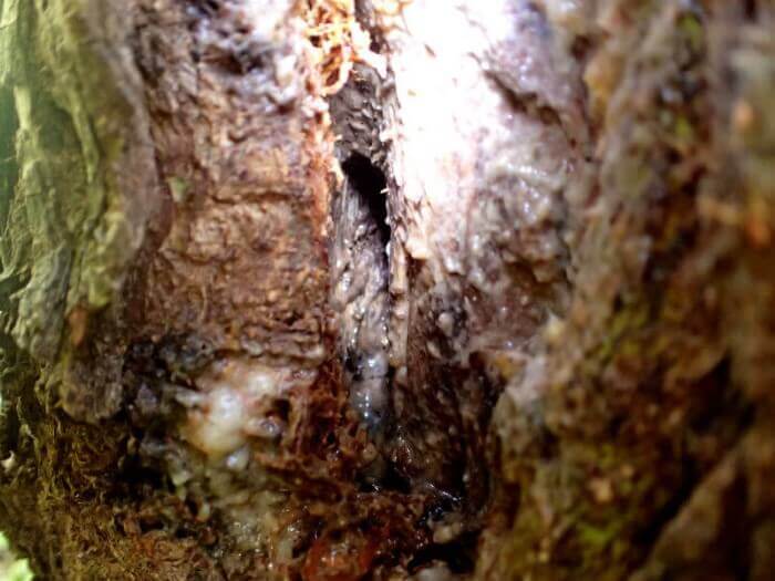 ボクトウガやコウモリガの幼虫が穿孔した箇所から樹液が出て、それが暑い気温で発酵し、辺りいっぱいに甘酸っぱいまるでお酒の様な臭いを漂わせています。