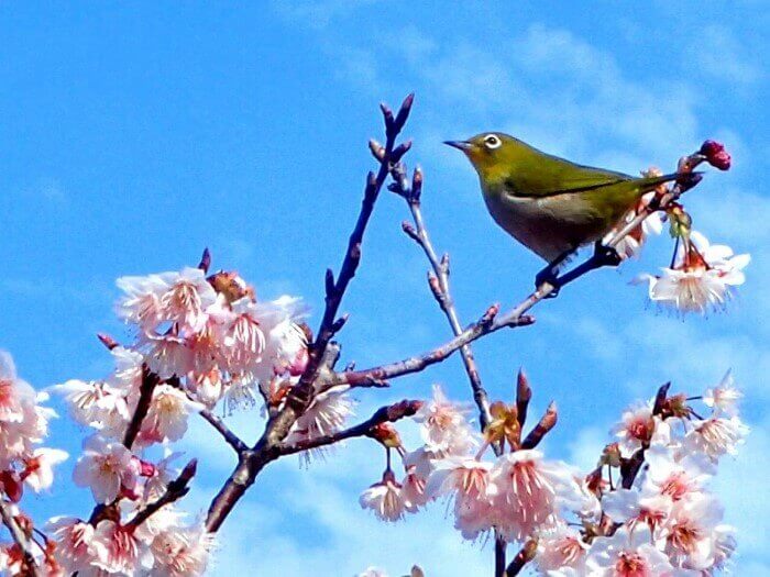 メジロは目の周りが白く、何羽かの群れで行動していることが多いです。