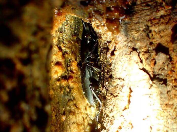 こちらのハルニレの木の隙間に隠れようとするクワガタのお尻を見つけました。