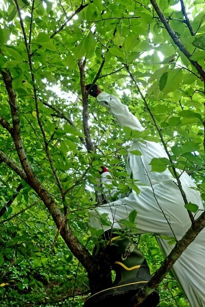 細いハルニレのウロをチェックするK氏