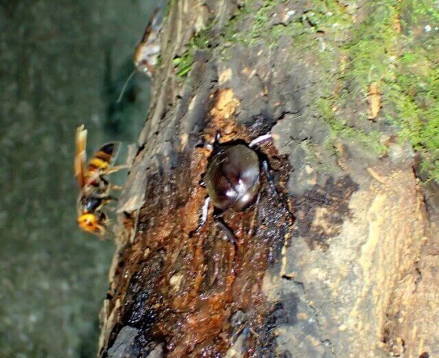こちらの木では、樹液にカブトムシ♂とスズメバチが来ていました。