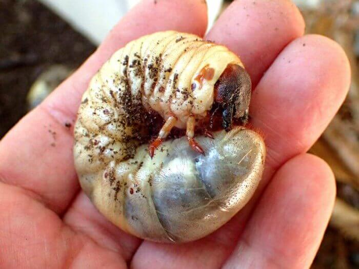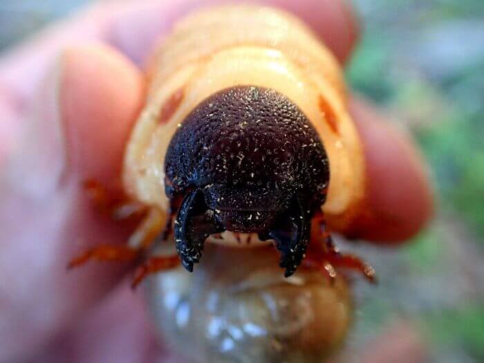 クワガタ幼虫と違い、頭部はガサガサしていて、色合いも茶褐色なので、すぐに見分けがつきますね。