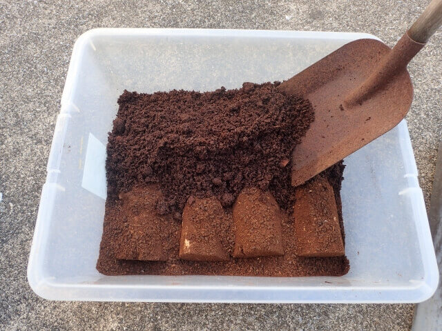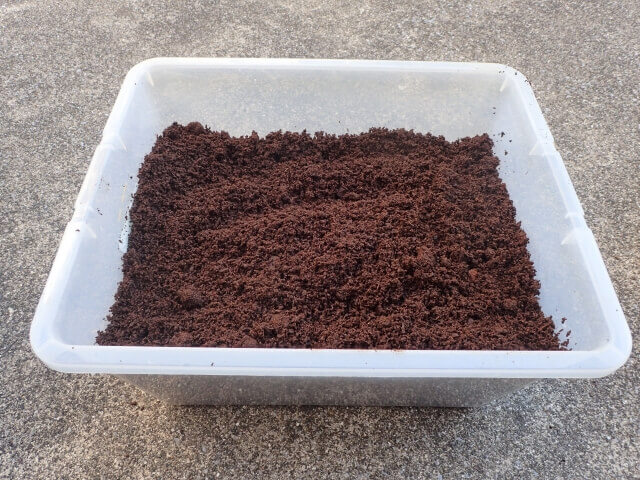 ⑭幼虫糞カス入れた上に④の廃マットを入れていきます。