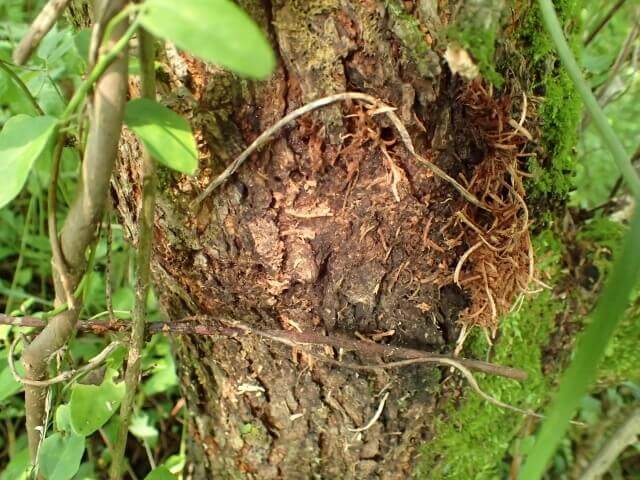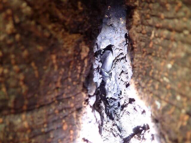 ハルニレの樹皮隙間に潜るようにクワガタの姿を発見。