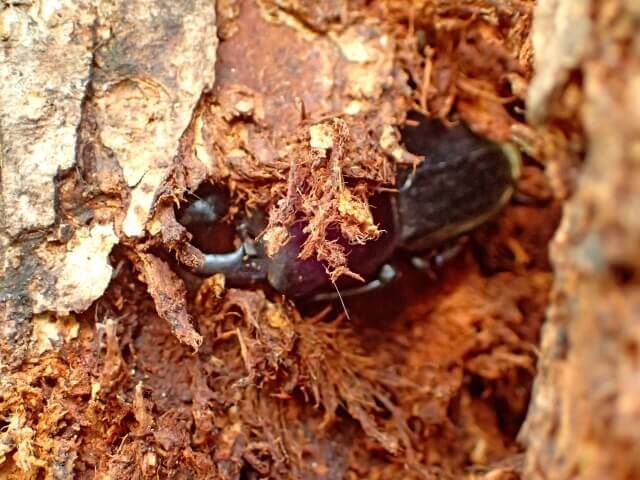 こちらには小さなヒラタクワガタ♂が狭い樹皮の隙間に潜んでいました。