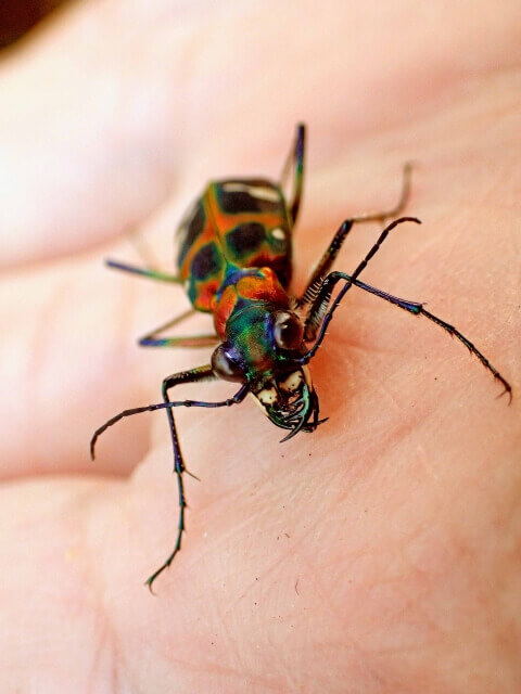 美しい色合いとは裏腹に、何とも強面の姿も相持つナミハンミョウ。