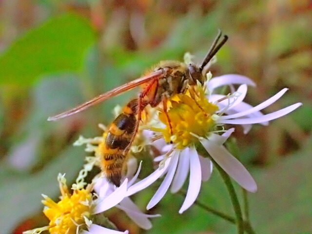 野外の菊種の花に来ていたのは、ツチバチの一種、アカアシハラナガツチバチ