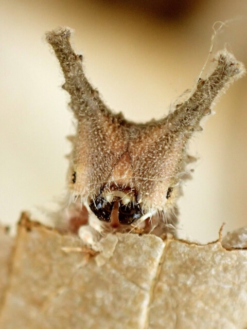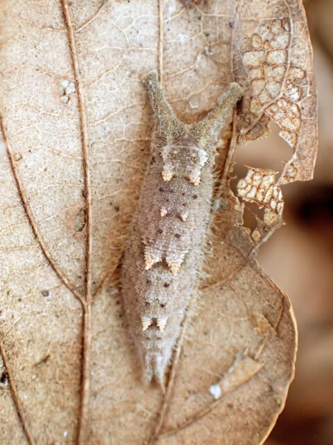 エノキの木を見つけたら、木のすぐ根元近くの落ち葉にいることが多いようです。あと木の幹にもくっ付いている幼虫もいました。