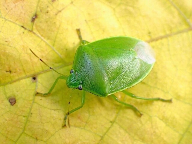 葉の上に居たのは、この時期でも元気いっぱいに活動しているツヤアオカメムシ