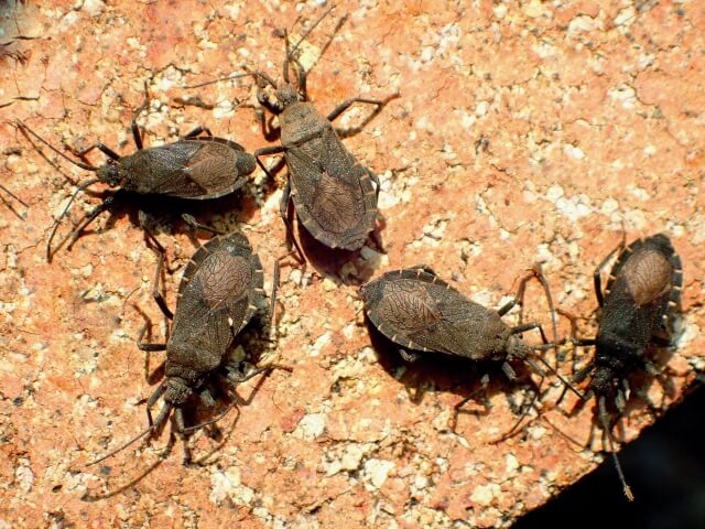 自宅庭にあったレンガブロックをひっくり返してみると、ツマキヘリカメムシの集団がいました。
