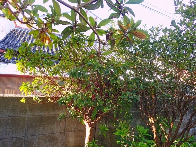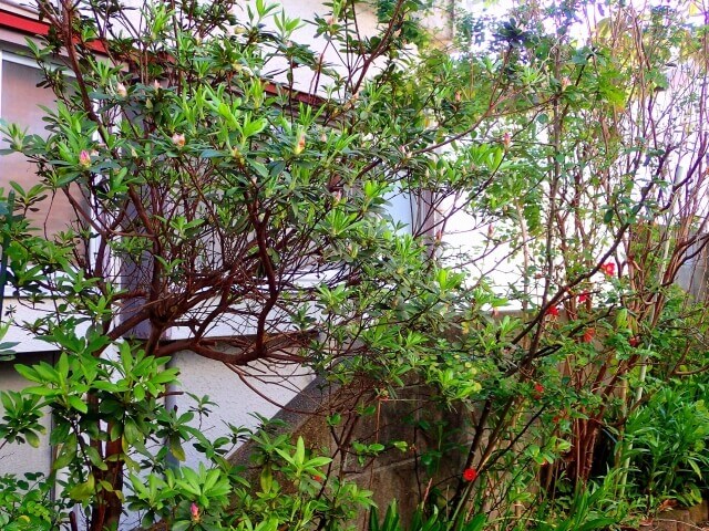まだ開花前のツツジの木、右側が金柑の木。