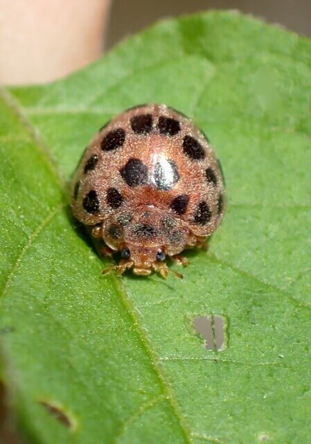 このニジュウヤホシテントウはテントウムシ種の一つですが、他のテントウムシと違い、アブラムシなどではなく葉を食します。