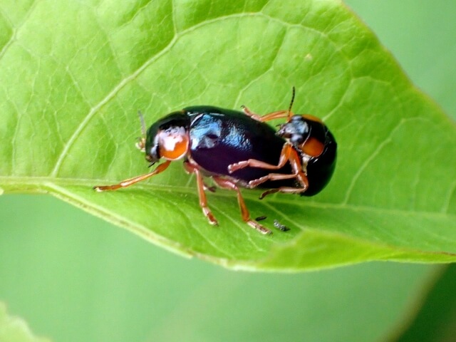 葉上で見かけたのは、キボシルリハムシ♂♀