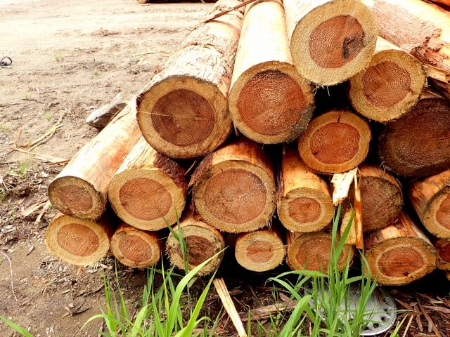 散策中、伐採された杉材が集まっているのをを見かけました。