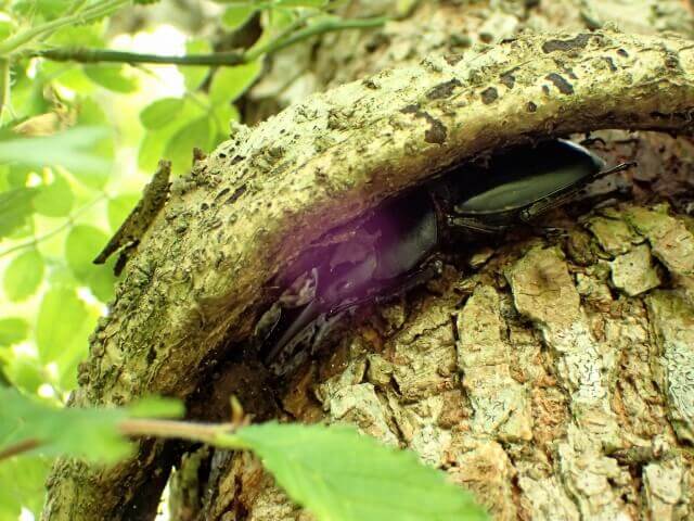 こちらの樹皮裏にはコクワガタ♂の姿