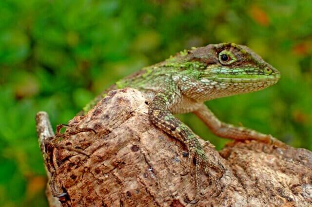 普段見かけるトカゲとは違ってグリーン色がキレイな小さいイグアナみたいでとても美しいです。