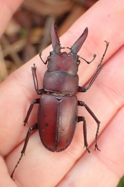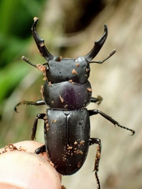 なんと、先程落ちて来たドングリに混じって、ノコギリクワガタ♂が落ちているのを見つけました!