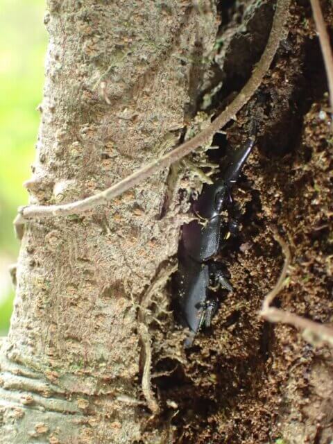 ツタと樹皮の隙間に隠れるコクワガタ♂の姿を発見!