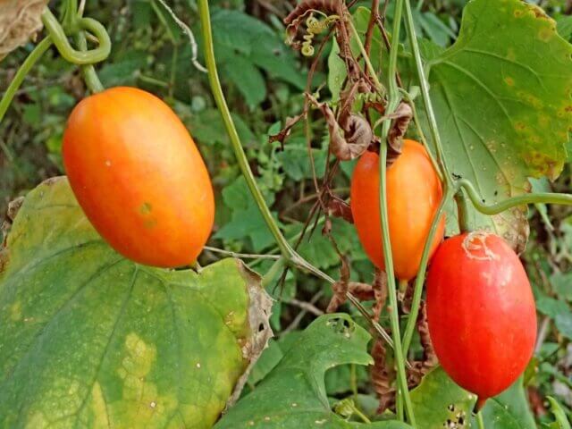 山のあちこちでカラスウリが実っています。