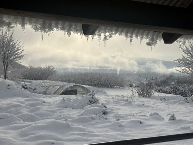 月夜野きのこ園本社がある会社周辺では雪が降っています。。