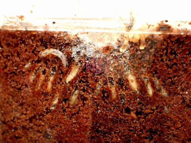 対策としては、本当はマット全交換が望ましいですが、幼虫達が見えるのは大体上の部分であることが多いので、その分を上から削り取っても良いかとも思います。