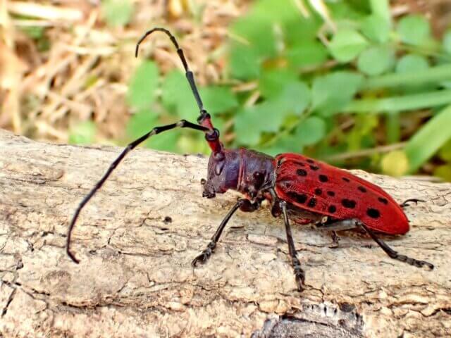 真っ赤な背中に黒い斑点が美しいホシベニカミキリ