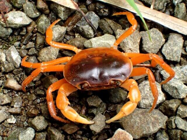 宮崎のサワガニはオレンジ色を基本に、頭部分が茶色っぽくなるツートン色タイプです。