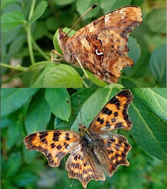 背中側の模様では他のタテハチョウとの区別は難しいですが、羽を閉じた時に見える「C」の文字が特徴です。