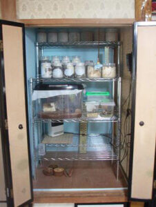 飼育用品はキャスター付の虫棚をずらすと出てきます。