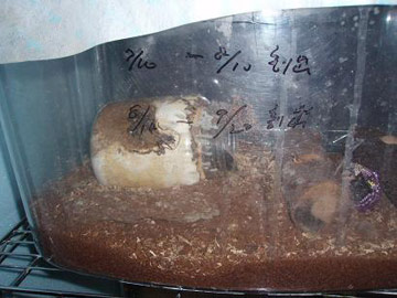 最初は仏間と言うことで抵抗が有りましたが、しっかり合掌してから使用しました。(笑) 電源も有り最高の飼育部屋だと思います。 費用 メタルラック2ヶと断熱材で1万円位 サーモスタットとファンヒーターで8千円位 飼育ポイント 断熱材を貼り、熱帯魚飼育で使用していたサーモスタットに ミニファンヒーター(600w)を接続し25℃に設定しています。