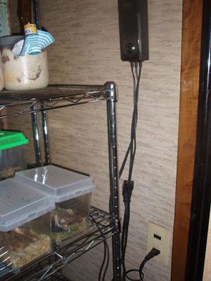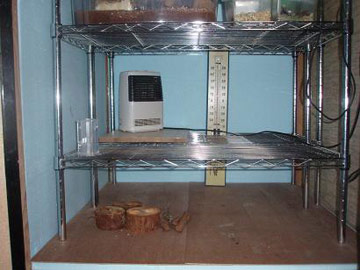 最初は仏間と言うことで抵抗が有りましたが、しっかり合掌してから使用しました。(笑) 電源も有り最高の飼育部屋だと思います。 費用 メタルラック2ヶと断熱材で1万円位 サーモスタットとファンヒーターで8千円位 飼育ポイント 断熱材を貼り、熱帯魚飼育で使用していたサーモスタットに ミニファンヒーター(600w)を接続し25℃に設定しています。