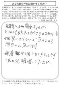 購入時にカブクワのステッカーなんか入っていろと嬉しいかな、グッズなんか当たると嬉しいです。