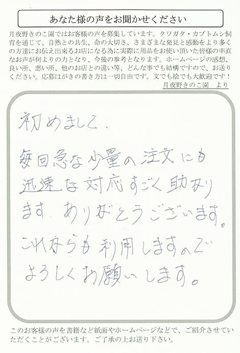 三重県 山崎 様 対応 X Facebook はてブ LINE Pinterest コピー 2012.09.26 初めまして、 毎回急な少量の注文にも 迅速な対応すごく助かります。 ありがとうございます。 これからも利用しますので よろしくお願いします。