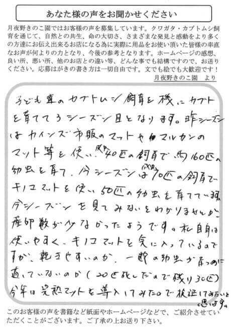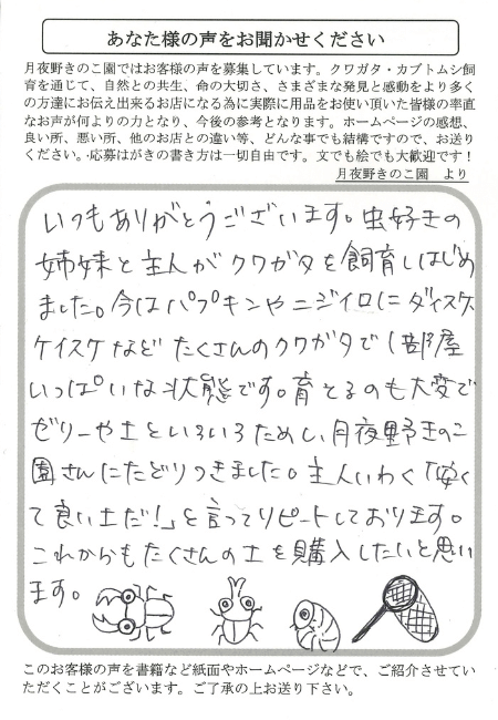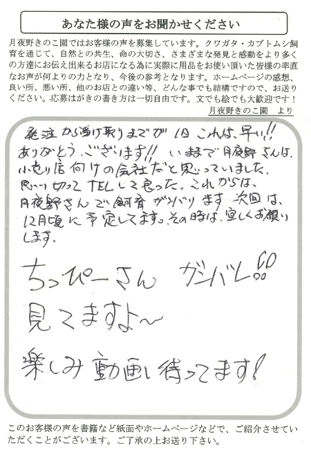 発注から受け取りまでが1日これは早い!!ありがとうございます!!いままで月夜野さんは、小売り店向けの会社だと思っていました。思い切ってTELして良かった。これからは、月夜野さんで飼育ガンバリます。次回は、12月頃に予定してます。その時は宜しくお願いします。