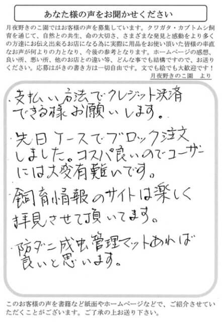支払い方法でクレジット決済できる様お願いします。先日ケースでブロック注文しました。コスパ良いのでユーザーには大変有難いです。飼育情報のサイトは楽しく拝見させて頂いてます。防ダニ成虫管理マットあれば良いと思います。