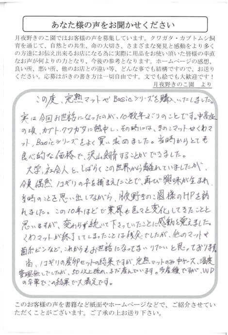 この度、完熟マットやBasicシリーズを購入いたしました。実は今回お世話になったのが、10数年ぶりのことです。中高生の頃、カブトクワガタに熱中し、その時には、きのこマットやくわマット、Basicシリーズをよく買い求めました。当時からとても良心的な価格で、たくさん飼育することができました。大学、社会人と、しばらくこの世界から離れていましたが、今夏偶然ノコギリの♀を捕まえたことで、再び興味が生まれ、当時のことを思い出しながら、月夜野きのこ園様のHPを訪れました。この10年ほどで業界も色々と変化してきたことと思いますが、変わらず続いて下さっていたことに感動を覚えました。くわマットが終了してしまったことは残念でしたが、他のマットや菌糸ビンなど、これからもお世話になってまいりたいと思っております。尚、ノコギリの産卵セットの結果ですが、完熟マットのみ中ケース、温度管理無しでしたが、50以上採れ、まだ産んでいます。多産種ですが、WDの♀単でこの結果で大満足です。