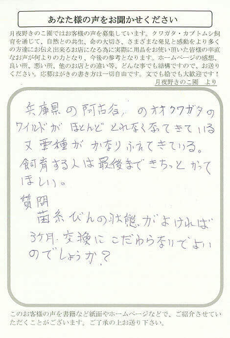 大阪府 大堀 様 その他 X Facebook はてブ LINE Pinterest コピー 2013.02.20 兵庫県の阿古谷のオオクワガタのワイルドがほとんど取れなくなってきている又亜種がかなりふえてきている。飼育する人は最後まできちっとかってほしい。 質問 菌糸ビンの状態がよければ3カ月交換にこだわらないでよいのでしょうか? 【月夜野きのこ園】より菌糸ビンの状態がよければ期間にこだわらなくても良いと思われます。ただし、表面上に問題が無く、居食いなど内側から食べて行っている可能性もございますので確認はした方が良いです。以上となりますが、ご参考にして頂ければ幸いです。