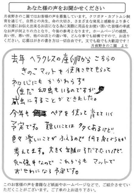 去年ヘラクレスの産卵から、こちらのきのこマットを使用させてもらって初心にもかかわらず(まだ幼虫もいるのですが)成虫にすることができました。今年もペアを使って育てていく予定です。難しいことは多くあるけど、色々楽しいことがふえるので何を育てようとか考えてます。大きく立派にそだてたいけど、勉強中なので、これからもマットでおせわになる予定です。